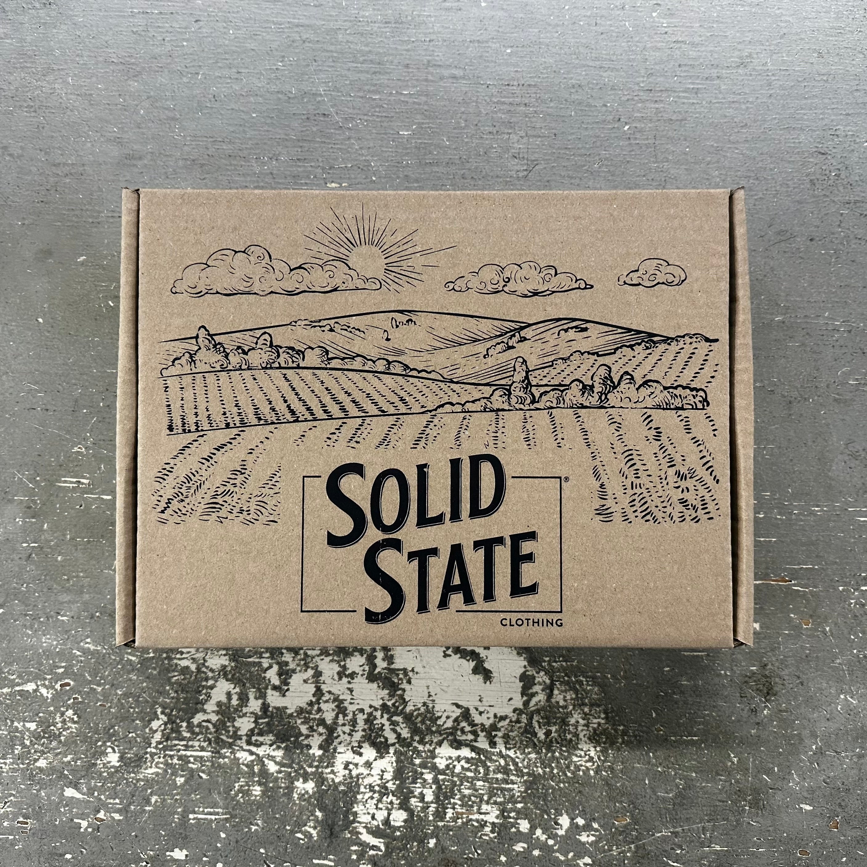 Packaging accounts for 37% of total plastic waste in the United States. All Solid State Clothing packaging 100% recycled cardboard, 95% of which comes from post-consumer waste, by EcoEnclose. We print the boxes in house with waste-based inks. Order with peace of mind, you will never have to go through layers of plastic to get to your garment!